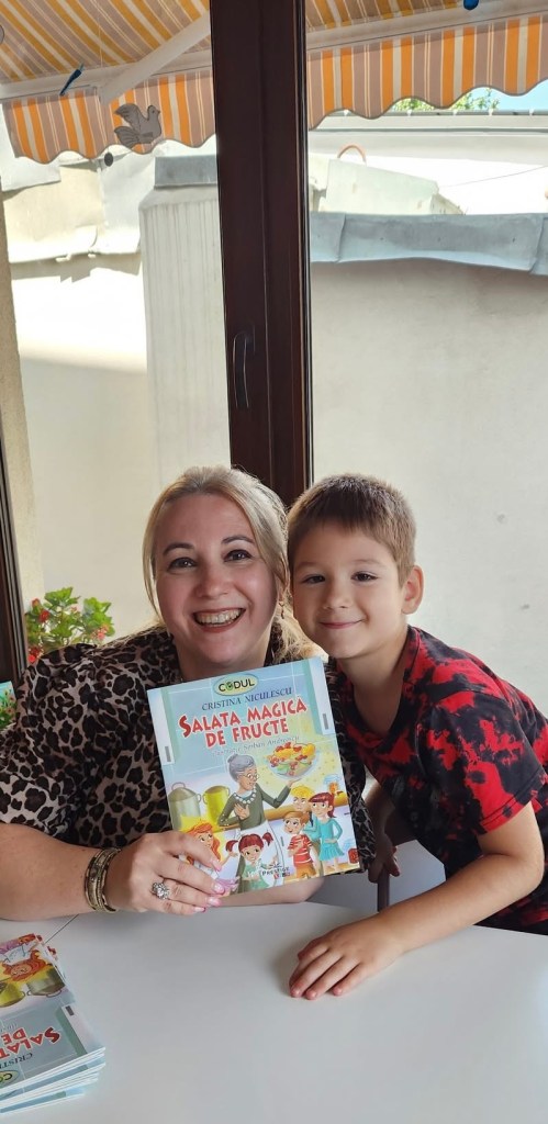 Si pentru ca video-ul se deruleaza cu rapiditate, las aici, pentru posteritate si scriptul testimonialului:  “«Salata magică de fructe» este povestea ideală pentru o zi ploioasă sau friguroasă! Atenție, e contagioasă! După lectură, vă garantăm o oră – două de distracție savuroasă, împreună cu copiii, urmând întocmai instrucțiunile din carte! Vă invităm la o porție sănătoasă de poveste! Poftă bună!” – Cristina Donovici, Autor cărți pentru copii, seria “Poveștile Cristinei”.